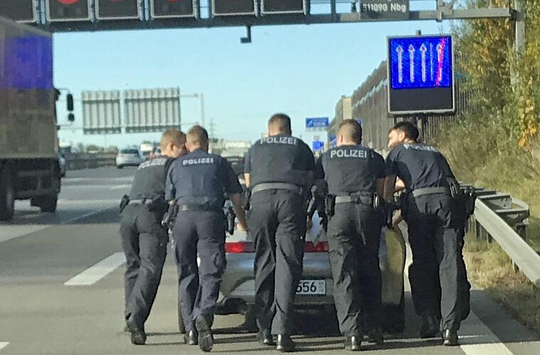 Wenn das Auto den Dienst versagt müssen alle mit anpacken - auch die Polizei. Um ein liegen gebliebenes Fahrzeug von der Autobahn zu bekommen, entschloss sich die Bundespolizei kurzerhand das Auto bis zur nächsten Raststätte zu schieben.