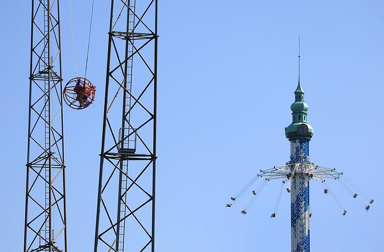 - Freifallturm (109 Meter Gesamthöhe, Fallhöhe 93 Meter): In zweieinhalb Sekunden Richtung Boden – mit einer Geschwindigkeit von bis zu 113 Kilometern pro Stunde. Bei klarem Wetter hast du einen spektakulären Blick auf die Alpenkette. Für Kinder ab zehn Jahren und Erwachsene.