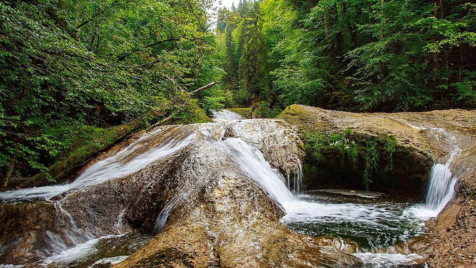 Ebenfalls im Allgäu liegt in der Nähe von Oberstaufen und Isny die Eistobelschlucht. Sie führt dich zwischen Maierhöfen und Grünenbach über 3,5 Kilometer vorbei an Wasserfällen, bis zu fünf Metern tiefen Strudellöchern und riesigen Felsblöcken. Verschiedene Gesteinsschichten, die im Laufe von mehreren Millionen Jahren entstanden, liegen hier schräg aufeinander. In diesem einzigartigen Naturschutzgebiet leben zahlreiche seltene Tier- und Pflanzenarten.