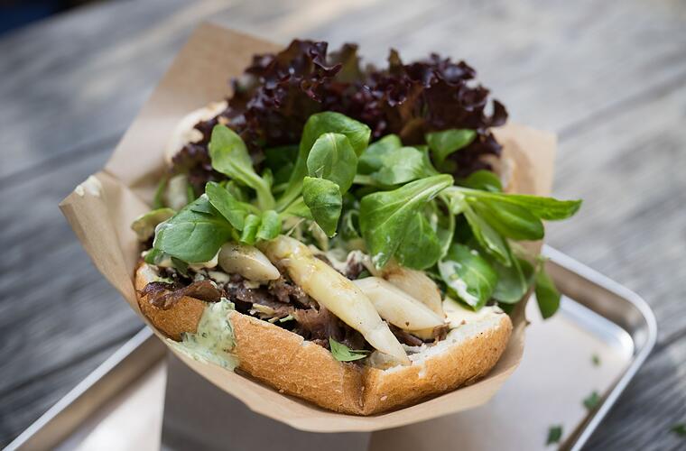 Seit dem Start der Spargelsaison verkauft ein Berliner Imbiss das Edelgemüse nun auch im Fladenbrot. "Döner Beelitzer Art" heißt die Kreation des Kochs Felix Schneider aus dem Restaurant "Kebap with attitude" in Berlin-Mitte. Im Fladenbrot wird weißer Spargel dort mit gegrilltem Rindfleisch, Feldsalat, Sauce Hollandaise, Erdbeer-Ingwer-Marmelade und Bärlauch-Mayonnaise serviert. Es ist eine saftige Kombi abseits des bekannten Klassikers, für die man einen kleinen Stapel Servietten braucht.