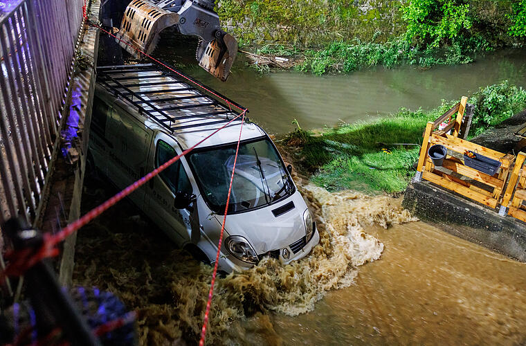 Die Autos, die die Fluten mitgerissen hätten, seien an einer Brücke angeschwemmt worden, sagte der Sprecher. Dort sorgten sie dafür, dass sich das Wasser zusätzlich staue. Die Fahrzeuge würden nun mit schwerem Gerät - etwa Baggern und Radladern - geborgen.