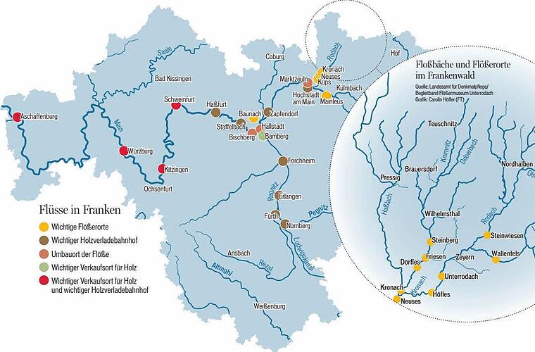 Doch die Flößerei war mehr. Sie bestand nicht nur aus mutigen Männern, die Wind und Wetter auf Holzstämmen trotzten. Sie war ein ganzer Industriezweig - mit ausgeklügelten System dahinter. Der Frankenwald-Holzfäller ernährte damit ebenso seine Familie wie der Bierbrauer aus dem Bamberger Land, der die Flößer verköstigte, und der Schweinfurter Händler, der das Holz verkaufte.
