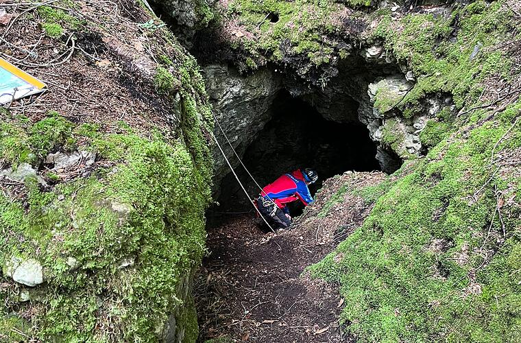 "Der Gesteinsbrocken hat den Eingang der Höhle namens Brändelbergloch verschlossen", sagte ein Polizeisprecher am Donnerstagabend (03. August 2023). Die beiden Gruppenmitglieder vor der Höhle riefen Hilfe herbei.