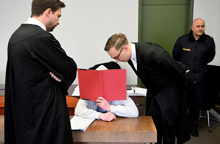 Der Angeklagte sitzt mit einem Ordner vor dem Gesicht und spricht mit seinen Anwälten Johannes Makepeace (l.) und Andreas Remiger (r.) vor Beginn des Prozesses wegen Mordes an seiner Großmutter im ...