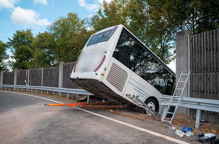 Ein Reisebus, der zuvor durch eine Lärmschutzwand gekracht, steckt zwischen Bäumen fest. Der Fahrer des Busses mit etwa 30 Fahrgästen an Bord verlor an einer Autobahn-Ausfahrt die Kontrolle über ...