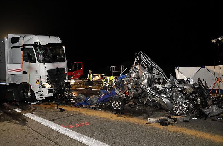 Ein weiterer Lkw krachte von hinten in das Auto und schob es samt Anhänger unter den davor stehenden Lastwagen. Der Autofahrer verstarb, die beiden Lkw-Fahrer erlitten leichte Verletzungen.