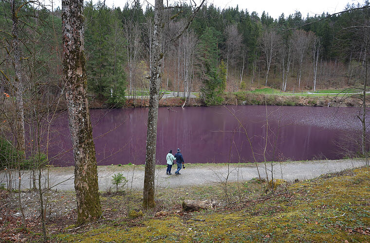 Etliche Interessierte hatten sich in den vergangenen Tagen bereits auf den Weg zu dem See gemacht. Eine Gesundheitsgefährdung für Mensch und Tier sieht Schindele nicht. Im Gegensatz zu Blaualgen, die auch immer wieder in Seen entstehen, bildeten die Purpurbakterien keine Gifte, sagte er. Derzeit würde wohl auch niemand in den Weiher zum Baden gehen, da keine Saison sei und das Wasser nach Schwefel stinke. Er geht auch nicht davon aus, dass Hunde, die gerne aus Gewässern trinken, krank werden können. "Das Wasser mögen die natürlich auch nicht."