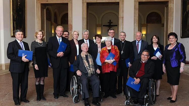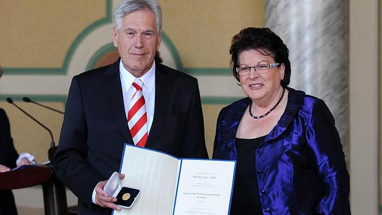 Landtagspräsidentin Barbara Stamm überreichte die Auszeichnungen im Maximilianeum in München. Ebenfalls geehrt wurden unter anderem Bambergs Erzbischof Ludwig Schick und der langjährige DGB-Chef Fritz Schösser. Weitere Politiker und Künstler waren bereits im Dezember mit der bayerischen Verfassungsmedaille ausgezeichnet worden - der Termin am Mittwoch war lediglich der Nachholtermin.