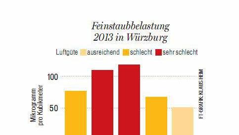 "Sehr schlecht" heißt auf der sechsstufigen Skala, dass die Belastung der Luft mit Feinstaub im 24-Stunden-Durchschnitt höher als 100 Mikrogramm pro Kubikmeter war. Der Spitzenwert in Würzburg: 136 Mikrogramm am 23. Januar gegen Mittag. Als unbedenklich gelten bis zu 50 Mikrogramm, der EU-Grenzwert. Auch in Schweinfurt, Bamberg, Kulmbach und Bayreuth wurden 100 Mikrogramm erreicht oder überschritten, in fast allen anderem fränkischen Städten fiel der Grenzwert.