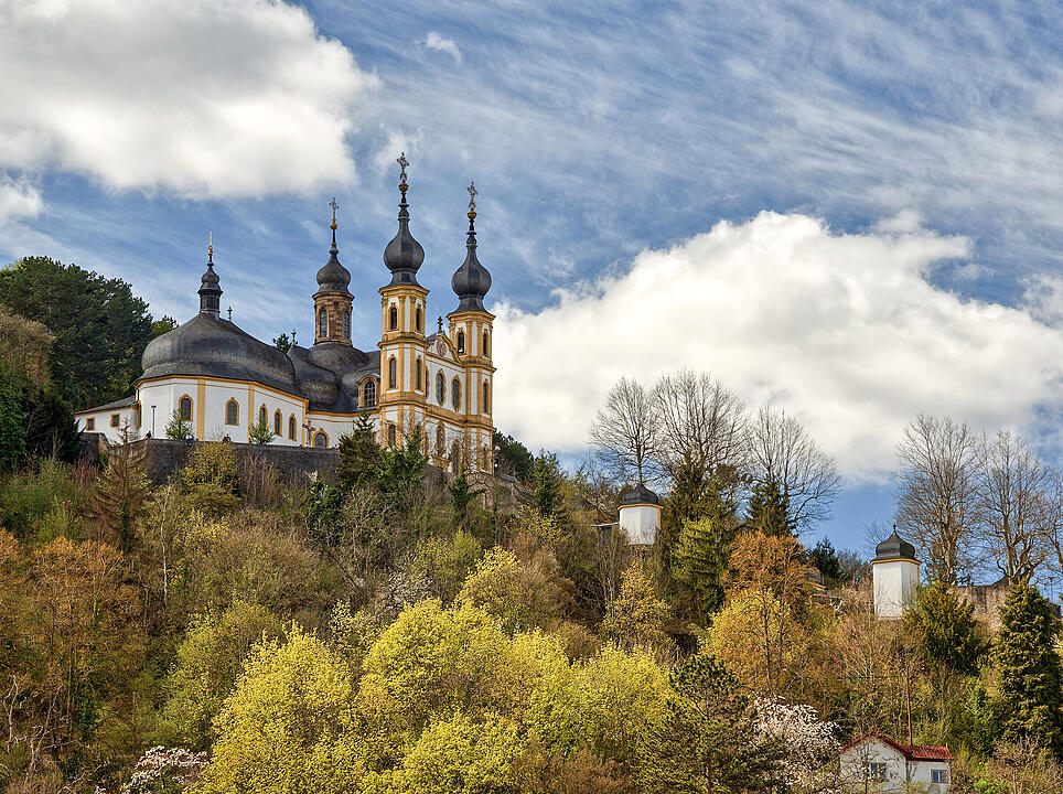Auf dem Nikolausberg in Würzburg erstrahlt die nach Plänen von Balthasar Neumann erbaute Wallfahrtskirche.