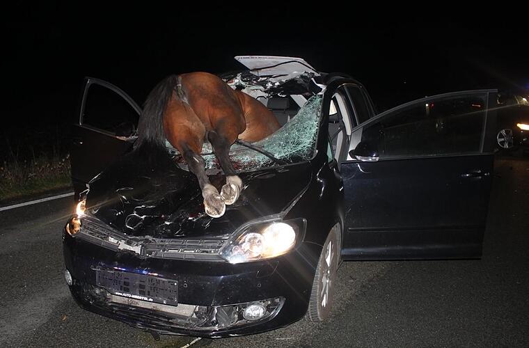 Die Stute landete auf der Motorhaube, durchschlug die Windschutzscheibe und verendete.