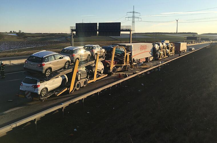 Während der Fahrer eines Lkw und der Fahrer eines Scania Autotransporters das Stauende bemerkten und dahinter bis zum Stillstand abbremsten, erkannte ein dritter Lkw-Fahrer die Situation zu spät. Er fuhr mit seinem MAN Sattelzug auf seinen Vordermann auf und schob dessen 40-Tonner auch auf den davor stehenden Laster.