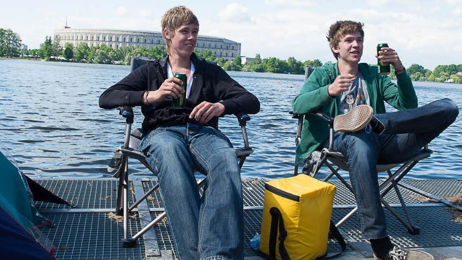 Auch das regelt Wolfgang Thiel. Dort wo die Häuschen voll sind, schickte er die Klomänner. Ausleeren. Zwei Mal am Tag. Mindestens. Zum Beispiel am Zeltplatz A. Karl, der Flosch und der Rockgott campen dort. Direkt am Dutzendteich, auf einem schmalen Rasenstreifen zwischen See und Parkplatz. Karl (30) und der Flosch (34) kommen aus Kolbermoor. Der Flosch hat den Rockgott gebaut. Dreieinhalb Meter hoch, Styropor und Epoxidharz. Die Augen sind Tischtennisbälle, die im Dunkeln leuchten, außerdem kann der Rockgott aus dem Mund rauchen. Der Flosch heißt eigentlich Florian Schulz, ist Tätowierer und betreibt eine Kulturkneipe. Aber die hat jetzt zu. Wirt, Gäste und Boxen sind im Park. Feiern. Rocken. Pfannkuchen machen aus 30 Liter Teig. Karl grinst. "Weil wir halt die besten sind." Für Karl und Flosch ist der Park etwas besonderes. Da kann man nicht nur so kommen. Deshalb die über 160 Watt im Bus. Deshalb die Pfannkuchen für über 40 Mann. Deshalb die 40 Stunden Arbeit für den Rockgott.