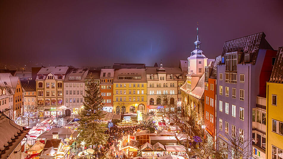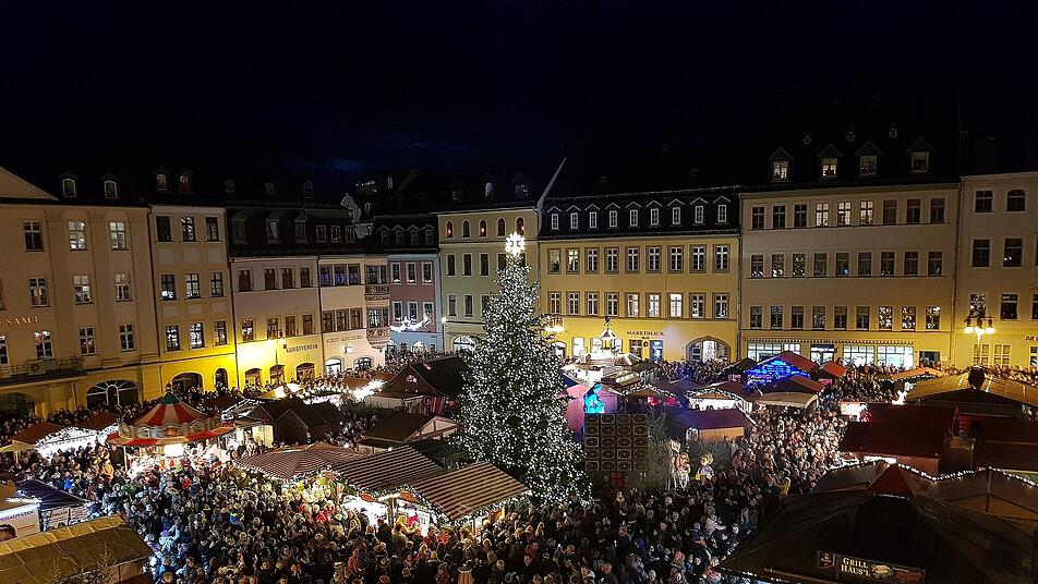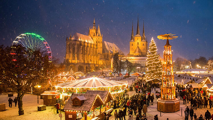 Den größten Weihnachtsmarkt Thüringens in Erfurts historischer Altstadt rund um Domplatz, Mariendom und Severikirche kannst du vom 25. November bis 22. Dezember 2025 besuchen. Es erwartet dich unter anderem die 25 Meter hohe Weihnachtstanne, eine Krippe mit fast lebensgroßen Holzfiguren und ein fünf Meter großer Adventskranz auf den Domstufen. Probiere Thüringer Spezialitäten wie das Erfurter Schnittchen (ein Christstollen) und die berühmte Thüringer Bratwurst. An den Ständen findest du Christbaumschmuck, Blaudrucktextilien, Töpferarbeiten und erzgebirgische Volkskunst. Geöffnet ist der Markt von 10.00 bis 20.00 Uhr, Donnerstag bis 21.00 Uhr und Freitag/Samstag bis 22.00 Uhr.