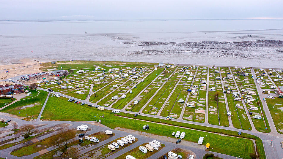 Übernachtungszahlen beim Camping steigen auf Rekord: Zahlreiche Wohnwagen und Wohnmobile stehen bei sonnigem Wetter auf einem Campingplatz am Jadebusen in Dangast (Niedersachsen).