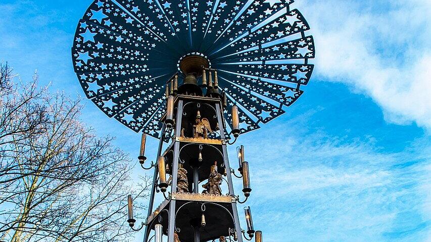 In fast jedem Ort des Erzgebirges finden Weihnachtsmärkte statt. Hier findest du gemütliche Märkte fernab von Trubel und Gedränge. Überall wird erzgebirgische Holzkunst angeboten und oft findest du die typischen Weihnachtspyramiden und Schwibbögen auch als riesengroße Dekoration auf Plätzen und Dächern. Der Schwarzenberger Weihnachtsmarkt gilt als einer der schönsten in Sachsen. Vom 5. Dezember bis zum 14. Dezember 2025 täglich von 11.00 bis 20.00 Uhr kannst du in den Straßen und Gassen des denkmalgeschützten Altstadtkerns die Weihnachtsbuden besuchen. Mittelalterliches Markttreiben im Schlosshof, ein Weihnachtsberg mit lebensgroßen Figuren, die älteste noch erhaltene Großpyramide der Welt und vieles mehr erwartet dich. Beliebt ist auch der Schwarzenberger Märchenumzug am zweiten Adventssonntag.