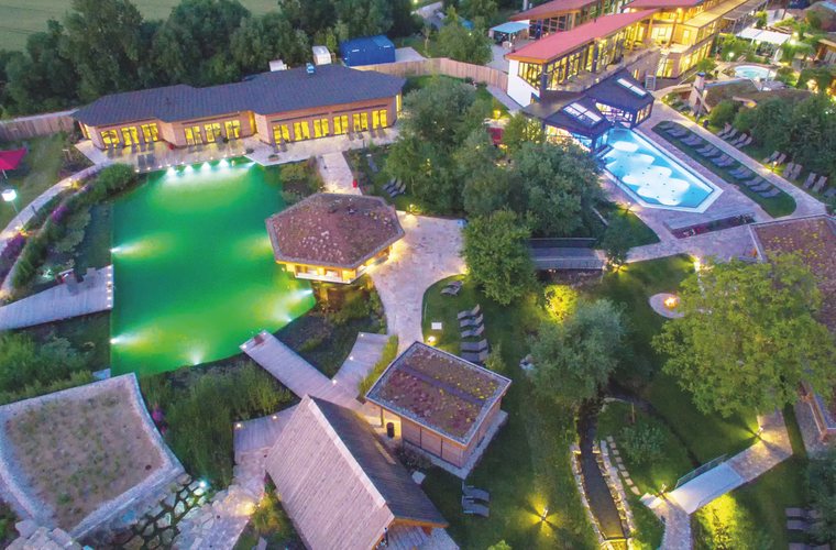 Über eine Schleuse gelangen die Gäste in das Außenbecken mit 32 Grad warmem Wasser und einer Nackenmassage durch eine prasselnde Schwalldusche. Die auf zwei Ebenen angelegte Saunalandschaft wurde ebenfalls mit einem Qualitätssiegel ausgezeichnet.