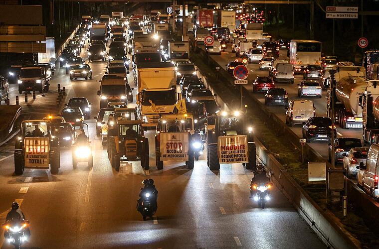 Nachdem protestierende Landwirte in Paris trotz Absperrungen der Polizei am Donnerstag bereits mit Dutzenden Traktoren in die Innenstadt vorgedrungen waren, fuhren sie am Freitagmorgen im Schneckentempo mit ihren Fahrzeugen auf die Stadtautobahn und behinderten den Verkehr. Demonstrierende Landwirte stellten sich auch mit Protestbannern auf die Fahrbahnen.