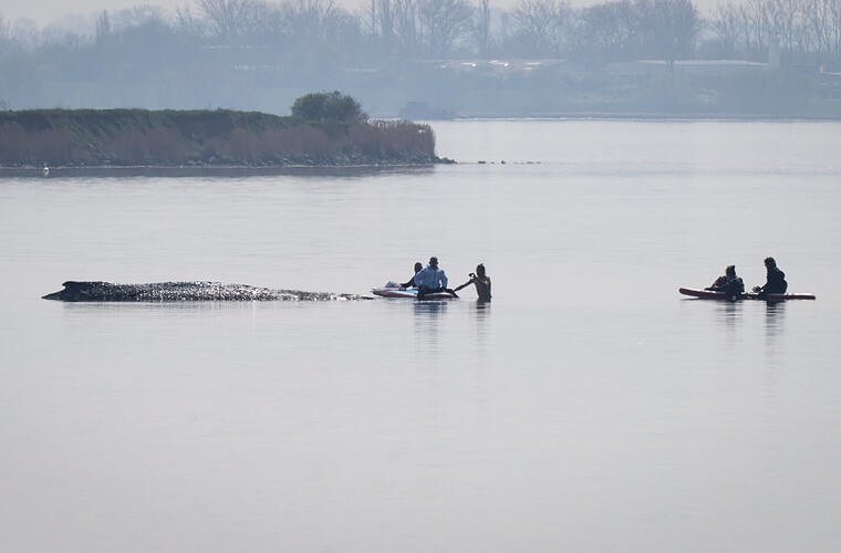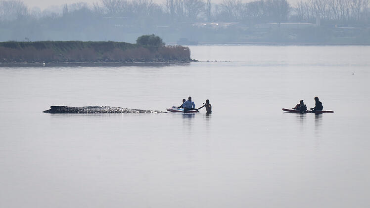 Bei Anstieg des Wasserstands will ein Expertenteam versuchen, den Wal zum Wegschwimmen zu animieren, etwa durch Klatschen mit dem Paddel auf das Wasser.