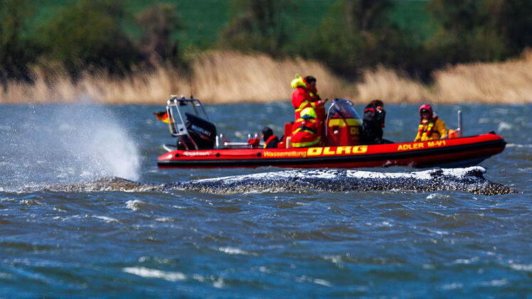 Als das Experten-Team mit der Wasserschutzpolizei am Morgen mit einem Schlauchboot in die Nähe des Tieres gefahren war, hatte der 12 bis 15 Meter lange Wal nicht stark reagiert. "Wir haben auch versucht, ihn durch Lärm zu animieren. Dazu haben wir mit dem Paddel aufs Wasser geschlagen, um zu gucken, ob er sich bewegt und dadurch zeigt "Oh, das stört mich!". Da kam aber auch keine Reaktion zurück und das zeigt auch noch, dass das Tier weiterhin geschwächt ist."