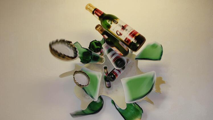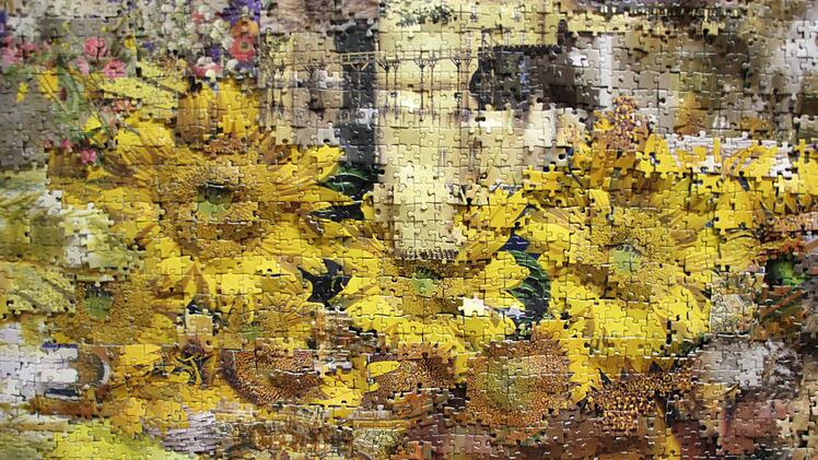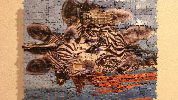 Der 1962 geborene Mayer studierte an der Nürnberger Akademie der bildenden Künste und lehrte dort auch. Beeinflusst von amerikanischen Pop-Art-Künstlern wie Jess Collins und Al Souza, verwendet Mayer als "Elementarteilchen" - die Anspielung auf Houellebecqs Skandalroman ist originell - banale Puzzlestücke, wie sie ein süddeutscher Verlag millionenfach vertreibt. Von dem bezog der Puzzlekünstler für sein Monumentalwerk auch ca. 100.000 Teilchen. Bei Mayer mäandern die verklebten Stücke auch in die dritte Dimension, bilden Wellen, zeigen mal psychedelisches Wabern, mal eine Stadt, mal ineinander verschlungene Farbmelangen, mal persiflieren sie, wie auf einer kleineren Puzzle-Collage in der Ausstellung, van Goghs Sonnenblumen. Im ersten Stock dann Ölgemälde des Nürnbergers, kunstvoll in den Raum arrangiert, die des Künstlers Faszination für die Ellipse widerspiegeln.
