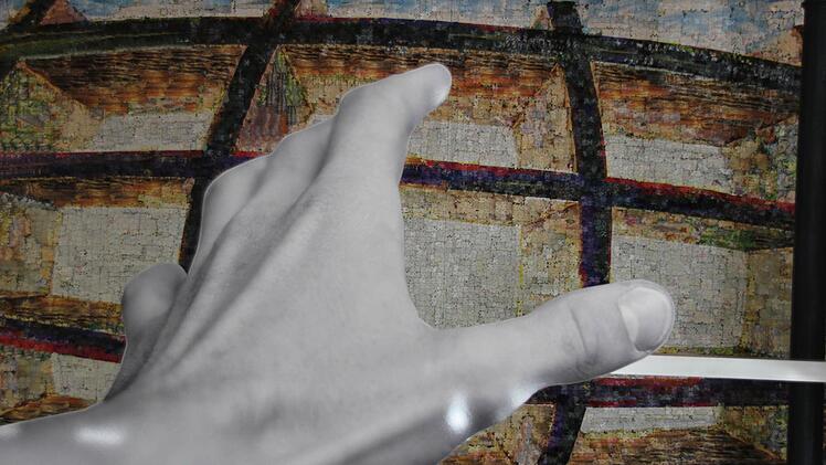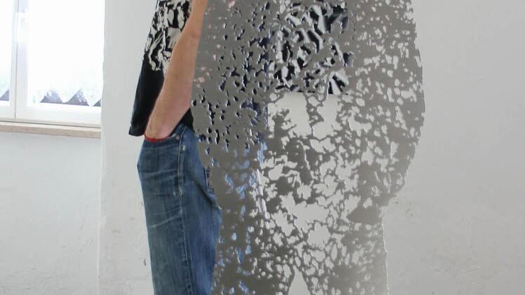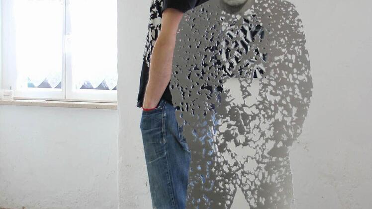 In einer Gemeinschaftsarbeit wollten die Aussteller "Struktur organisieren", wie Eller sagt. Mit Mayers elliptischen, streng schablonierten Figuren neben verfließenden Selbstporträts Ellers, montiert auf Dibond, Aluminium-Verbundplatten. Aber auch Mosaiken formt er, die Steine wie Foto-Pixel einsetzend. Eller fotografiert seine Objekte, sehr oft sich selbst, arrangiert sie am Computer, lässt sie auf Dibond drucken und arrangiert sie neu in drei Dimensionen. So wird der Fotografie das Element der Zeit genommen, argumentiert er; der Betrachter formt aus der inszenierten Realität eine neue. In der Tat wird die Wirklichkeit durch die Arrangements zur Kenntlichkeit entstellt, scheinbar Selbstverständliches in Frage gestellt, mitunter auch dämonisiert.