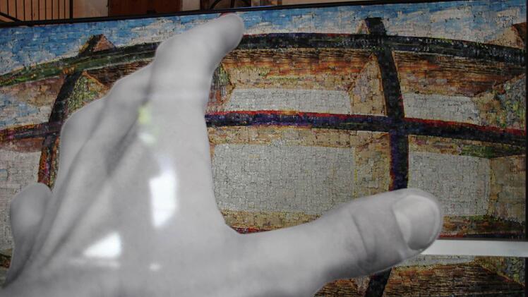 Die erste Assoziation ist: Arche. Der stromlinienförmige Aufbau der ungeheuren Komposition drängt dem Betrachter aus der Distanz das Bild in Auge und Hirn. Sechs Meter lang ist die Puzzlecollage "#65 1 MB - P" und 2,40 Meter hoch. Sie hängt in der Mürsbacher Kunstmühle und ist bis Oktober zu sehen.