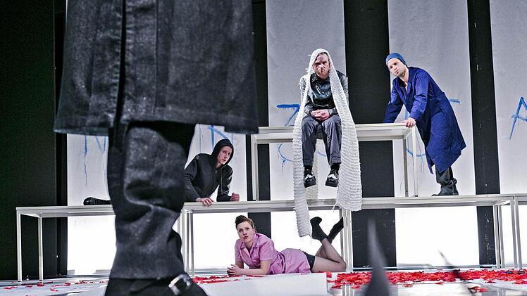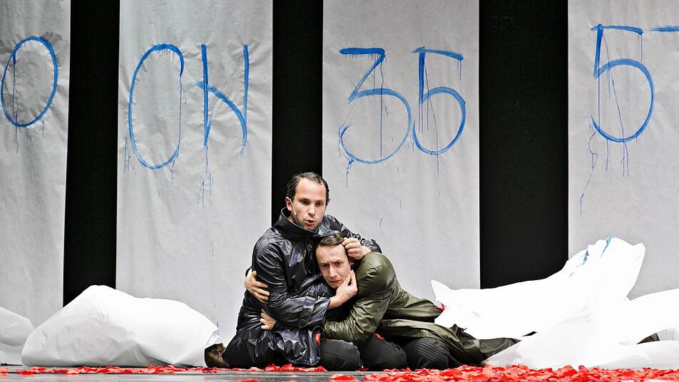 Dieser Ansatz wird nicht weiter verfolgt, blitzt allenfalls ab und an immer wieder einmal auf. Wir erleben mit, wie sich Josef K. durch ein Labyrinth erotischer und letztendlich metaphysischer Verstrickungen arbeitet. Die Bühne (Petra Wilke) jedoch ist schlüssig: Sechs Papierbahnen hängen vor einer ansonsten völlig kahlen Szenerie. Der Held selbst pinselt seine schrumpfende Lebensfrist darauf - im Lauf der Handlung hofft der erschöpfte Zuschauer, die Zahlen (365, 255 usw.) möchten sich doch schneller verkleinern. Doch wir müssen den Kreuzweg des Josef K.