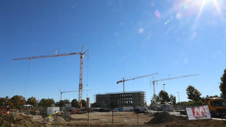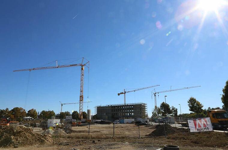 Die meisten Gebäude im "Pfaffensee" stehen schon, auf anderen Grundstücken stehen Baukräne und auf den letzten wird der Boden planiert. Das ging so schnell, weil sich die Firmen beim Kauf verpflichteten, innerhalb von maximal fünf Jahren zu bauen.