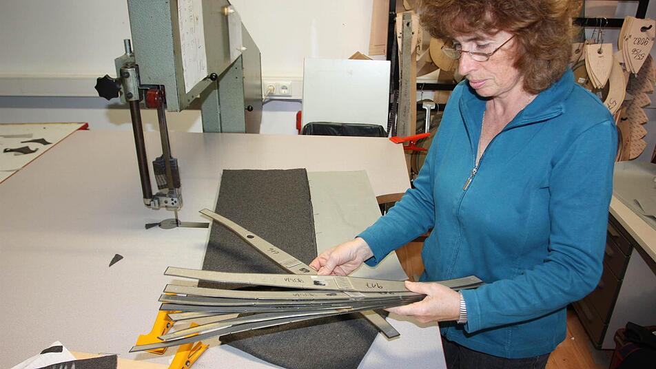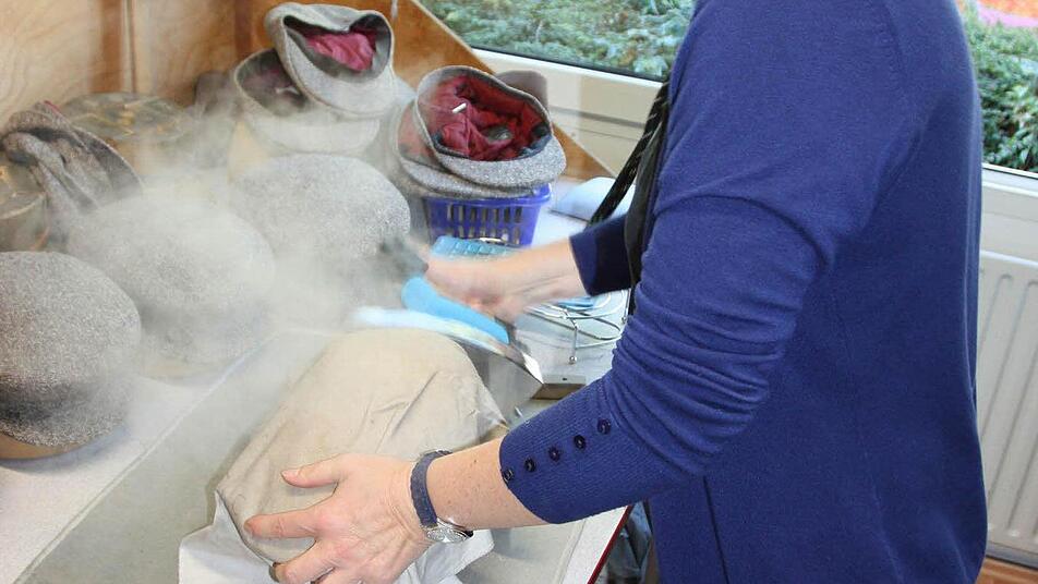 Bevor Maria Bornkessel die Mütze passgenau über den Holzkopf zieht und anschließend, Tuch darübergelegt, mit dem Dampfbügeleisen in Form bringt, waren schon viele flinke Finger im Einsatz. Elfriede Hartig steht an einem langen Holztisch und schneidet mit Schablonen die Grundformen aus den verschiedenen Stoffen aus, vor sich das lange Regal mit den Produkten aus Tuchfabriken und Webereien, hinter sich die vielen Schablonen, wovon noch etliche in Kisten lagern, versichert sie. Monika Post und Anni Niedermayer nähen alles zusammen inklusive besagtem Bullani Mützen-Etikett. Dieter Bullmann demonstriert, wie die Mütze fachgerecht verpackt wird. Am Ende der Produktionskette überwacht Jutta Bullmann, die, so ihr Gatte, "gute Seele" des Betriebs, was alles rausgeht.