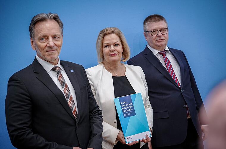 Auch der Präsident des Bundeskriminalamts, Holger Münch, berichtete, es gebe «in der rechten Szene vermehrt lose Kennverhältnisse und lockere, teilweise auch virtuelle Netzwerke anstatt ideologisch gefestigter und organisierter Gruppen». Faeser erklärte: «Insbesondere die sogenannte Neue Rechte versucht, ihre menschenverachtende Ideologie in die Mitte der Gesellschaft zu tragen. Der verlängerte Arm dieser Rechtsextremisten reicht bis in unsere Parlamente.» Die AfD wird vom Verfassungsschutz als rechtsextremistischer Verdachtsfall eingestuft.