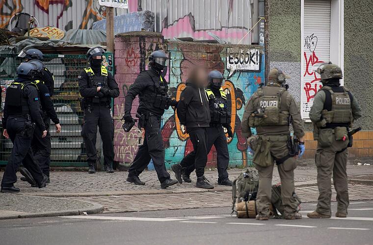 Beteiligt waren außerdem das Bundeskriminalamt und die Berliner Polizei. Der Einsatz begann gegen 7.30 Uhr an einem Gewerbegebiet am Markgrafendamm/Ecke Persiusstraße. Weitere Details nannte die Sprecherin zunächst nicht. Nach Beobachtung eines dpa-Reporters führte die Polizei zwei Männer ab.