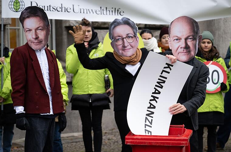 Vor der mündlichen Verhandlung des zuständigen 11. Senats protestierten Aktivisten mit Masken von Bundeskanzler Olaf Scholz (SPD), Bundeswirtschaftsminister Robert Habeck (Grüne) und Bundesbauministerin Klara Geywitz (SPD) vor dem Gericht. Dabei warfen sie ein Schild mit der Aufschrift «Klimakanzler» in eine Tonne.