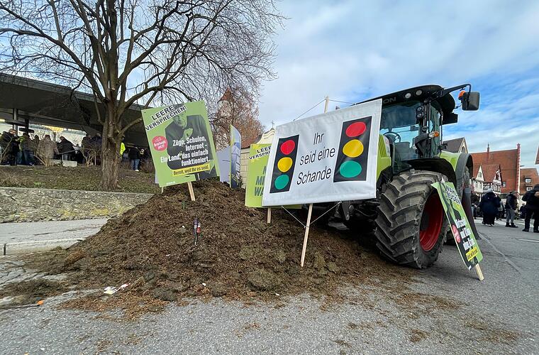 Die Proteste waren laut Polizei nicht angemeldet. Auch zu möglichen extremistischen Kräften darunter hatte ein Sprecher keine Erkenntnisse. Vor der Treppe zur Halle hatten Landwirte einen Misthaufen abgekippt, darauf Grünen-Wahlplakate, die die Demonstranten mit «leere Versprechen» gekennzeichnet haben. Immer wieder skandierte die Menge in Richtung Halle «Haut ab, haut ab». Journalisten wurden als «Lügenpresse» beschimpft. Zu sehen waren auch Flaggen des Königreichs Preußen.