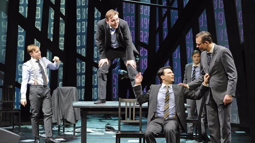 Das alles auf einer spartanisch mit Tisch und Stühlen ausgestatteten Bühne (Trixy Royeck), flankiert von perspektivisch verzerrten Metropolis-Kulissen, die an einen Holzschnitt Frans Masereels aus dem Zyklus "Die Stadt" erinnern. Große Schauspielerleistungen immerhin, auch mit reichlich Applaus belohnt, sind zu sehen. Sechs Protagonisten (zwei Frauen darunter) wechseln die geschätzt 30 Rollen rasend schnell, ein virtuoser Musikus (Thomas Prestin) zitiert auf Klarinette und Saxophon Mozart und Brahms, Gershwin, das Star Spangled Banner oder immer wieder mal eine Art angeschrägten Zeitlupen-Klezmer.