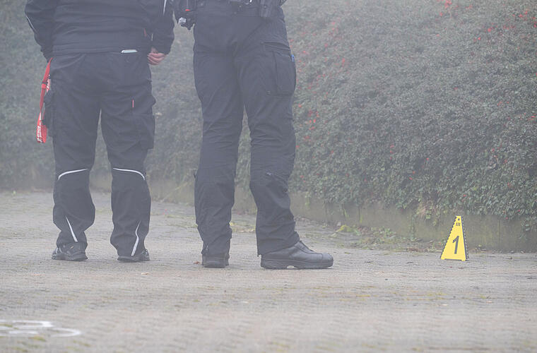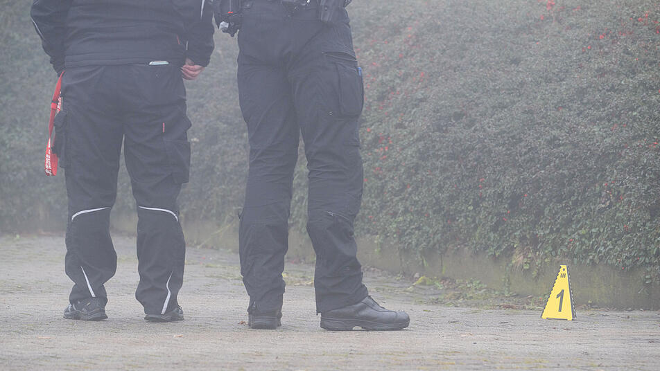 Zwei Polizisten sichern Spuren an einem Tatort in Steinheid, der von Nebel eingehüllt ist.