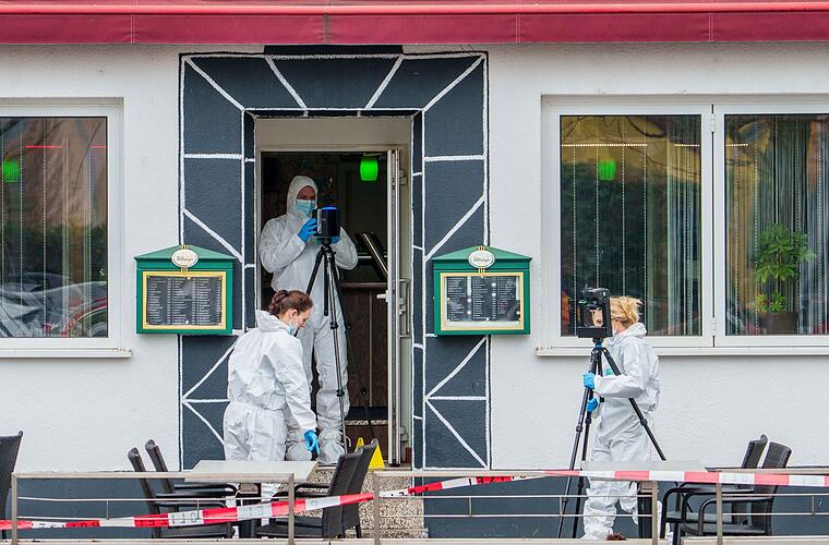 Das Lokal im Erdgeschoss des zweigeschossigen Gebäudes in der rund 17.000 Einwohner zählenden Stadt war mit roten Flatterbändern großräumig abgesperrt. Auf die Frage, wie der Täter möglicherweise im Zusammenhang mit dem Bistro steht, sagte ein Polizeisprecher: "Das müssen die weiteren Ermittlungen zeigen." Nach den tödlichen Schüssen floh der Schütze nach Polizeiangaben. Ob im Umfeld des Lokals schon früher mal ermittelt wurde, sei ebenso unbekannt.
