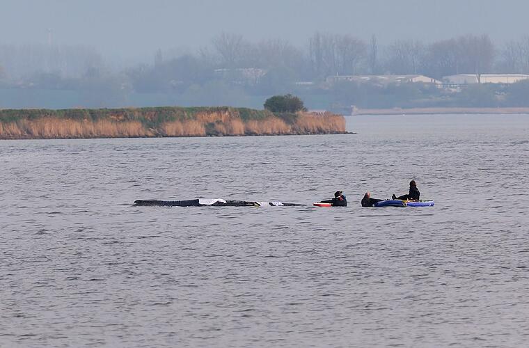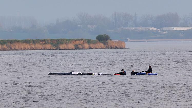 Als das Experten-Team mit der Wasserschutzpolizei am Morgen mit einem Schlauchboot in die Nähe des Tieres gefahren war, hatte der 12 bis 15 Meter lange Wal nicht stark reagiert. "Wir haben auch versucht, ihn durch Lärm zu animieren. Dazu haben wir mit dem Paddel aufs Wasser geschlagen, um zu gucken, ob er sich bewegt und dadurch zeigt "Oh, das stört mich!". Da kam aber auch keine Reaktion zurück und das zeigt auch noch, dass das Tier weiterhin geschwächt ist."