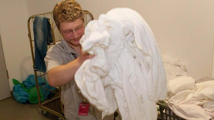 Geschleudert werden die Handtücher, mit denen sich die Musiker auf den Bühnen den Schweiß abtrocknen. Kann schon sein, dass vor Peter mal einer wie Phil Collins steht - und schnell was gewaschen haben will. Oder der Sänger von der Bands Hurts mit seinem Armani-Teilchen. Ansonsten wird in der Geschwindigkeit gewaschen, wie die Stars auftauchen und wieder verschwinden.