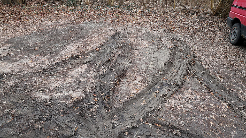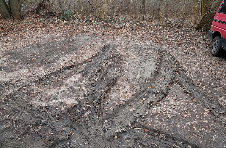 Fahrzeugspuren an einem wilden Parkplatz in einem kleinen Waldstück an der Albert-Einstein-Straße in Rostock, wo ein Spaziergänger eine Leiche entdeckt hatte ...