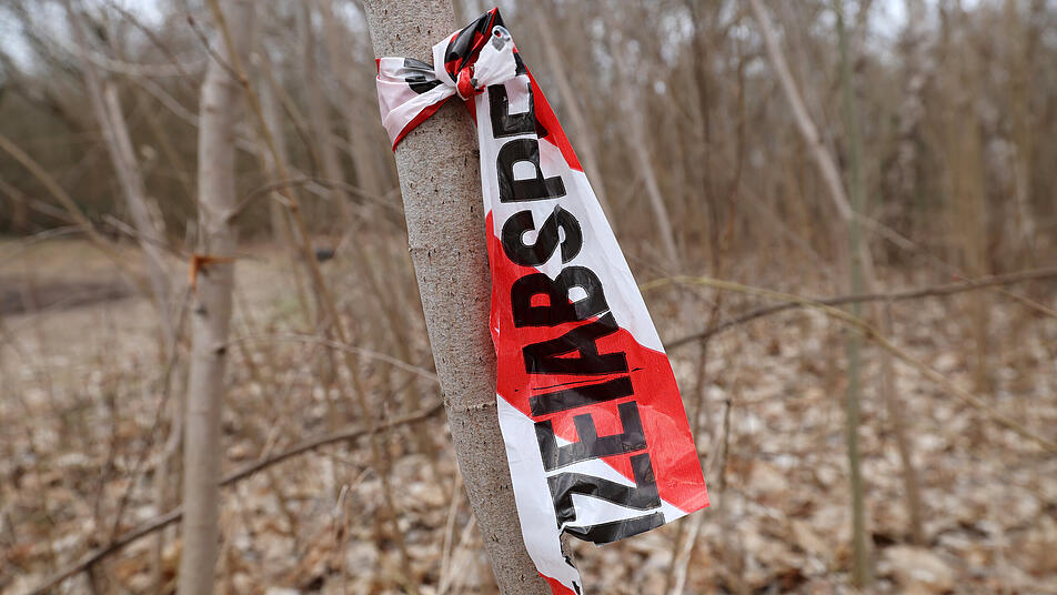 Die Reste einer Polizeiabsperrung sind an einem kleinen Waldstück an der Albert-Einstein-Straße in Rostock zu sehen, wo ein Spaziergänger eine Leiche entdeckt hatte ...