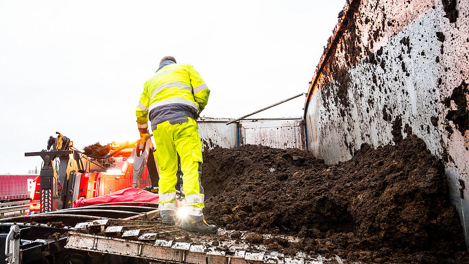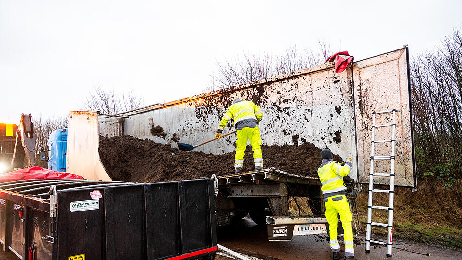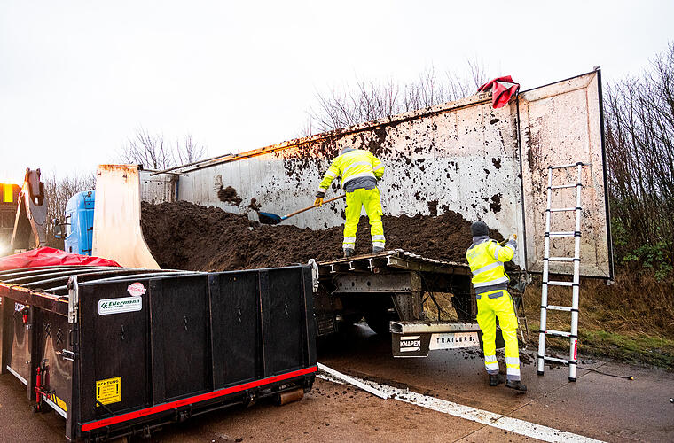 Der mit Mist beladener Lastwagen wird auf der Autobahn 1 nach einem Unfall entladen.