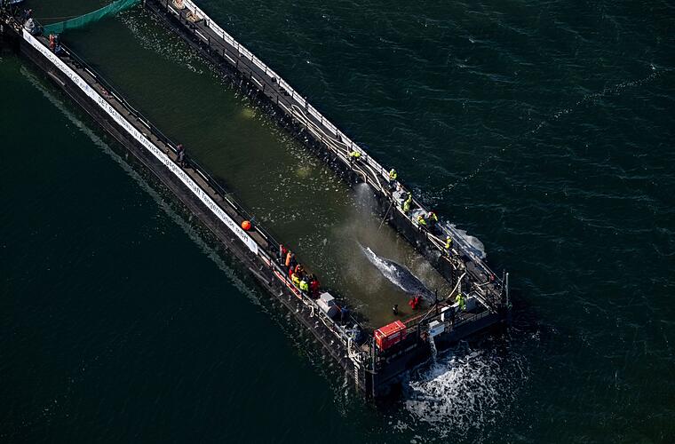 Mit der Verlegung des Wals in die Barge ging die Rettungsaktion am Dienstag in die entscheidende Phase. Über mehrere Stunden hinweg hatten Helfer das Tier in eine speziell ausgehobene Rinne manövriert. Mitglieder des Teams zogen den Wal mit Gurten zur Barge. Um 14.45 Uhr befand sich das Tier schließlich in dem abgesenkten Kahn. Danach wurde ein Netz gespannt, um zu verhindern, dass der Wal wieder hinausschwimmt. Kleinere Boote schoben die Barge dann aus der Kirchsee hinaus in die Wismarbucht, wo sie vom Schlepper "Robin Hood" auf den Haken genommen wurde.