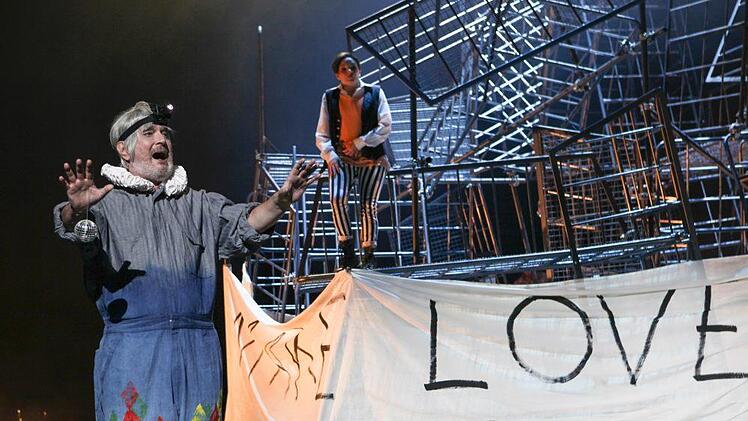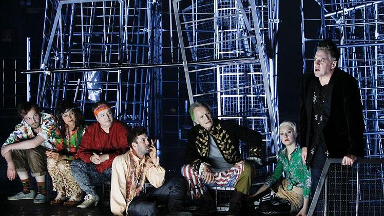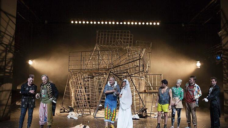 Regisseur Behnke ist das zusammen mit seinem Bühnenbildner Peter Scior hervorragend gelungen. Der Hof wird angedeutet durch nackte Metallgitter, die sich als Ardennerwald dann zu einem Berg aus Eisen und Draht türmen - da bleibt wenig vom arkadischen Idyll. Die Figuren in ihren zerfledderten Kostümen (Ayse Özel), mal dekonstruierte Uniformen, mal hippiesk, mal karikierter Freizeit-Look, liegen apathisch unter dem Drahtverhau oder turnen akrobatisch darauf herum - schon das schafft Distanz zum pastoralen Utopia. Keine Zuflucht, nirgends.