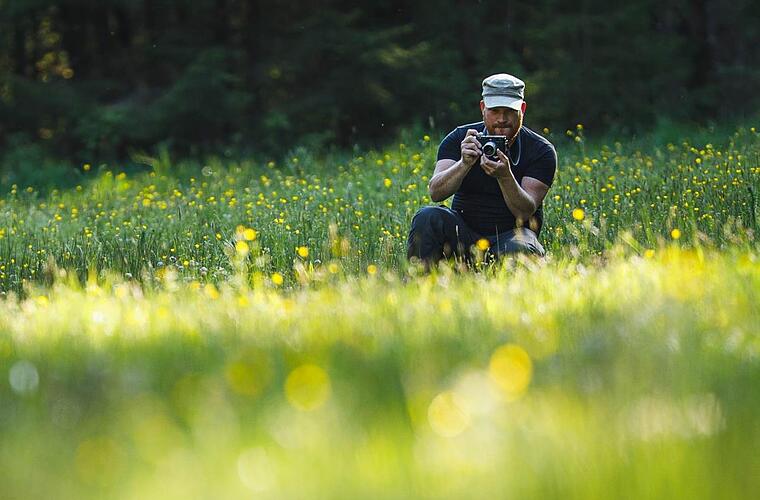 "Und man muss sehen, was fotografierenswert ist und was nicht. Statische Motive eignen sich anfangs am besten. Aber es gibt so viele, die man einfach beim Wandern oder beim Laufen entdeckt, wenn man nur langsam genug geht oder auch mal innehält. Wenn man sich nicht nur auf die Zeit konzentriert, sondern auf Entdeckungsreise geht." Eine nicht gemähte Wiese zum Beispiel, denn hier säßen die Schmetterlinge bei schlechtem Wetter auf den Grashalmen oder auf den Blüten, weil ihnen zum Fliegen zu kalt sei. "Da kann man sich dann einfach nur mal 15 bis 30 Minuten still an den Rand der Wiese setzen und beobachten. Wenn man Glück hat, kommt vielleicht sogar ein Reh mit einem Kitz vorbei. Das sind Momente, die man beim normalen Laufen gar nicht wahrnimmt." Ruhig verweilen und aufmerksam schauen, das seien die beiden besten Voraussetzungen für ein beeindruckendes Foto.