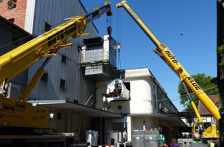 Das 13 Tonnen schwere Aggregat musste in die in sechs Metern Höhe liegende Eingangsluke zum Abfüllstandort gehievt werden. Dazu war eine filigrane Justierung von zwei Kranführern mit ihren 130- und 55-Tonnen-Kränen erforderlich. Wie knapp das war, zeigen die Maße: Die Eingangsöffnung ist 2,65 Meter breit, die neue Anlage exakt 2,625 Meter. Dieser Spielraum von knapp 2,5 Zentimetern erforderte also, salopp gesagt, einen guten Umgang, ein gutes Auge und technisches Können, um beim Anheben und Einführen in die Eingangsöffnung nichts zu beschädigen. Danach war großes Aufatmen bei den Geschäftsführern Christian und Anette Höfner zu spüren.