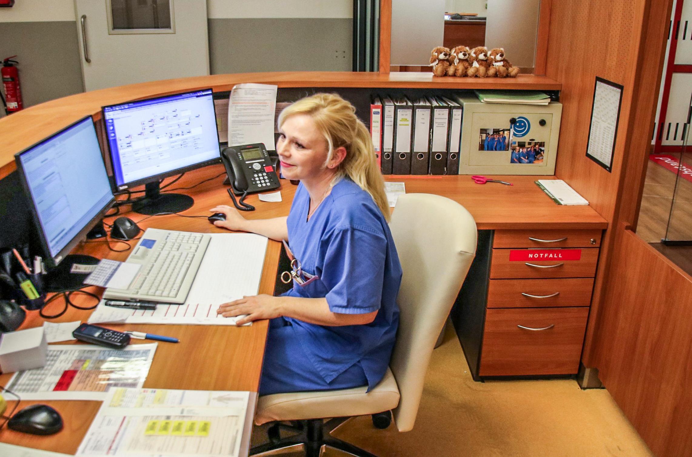 "Nicht jeder versteht, dass es bei uns nach Dringlichkeit geht, manche beschweren sich", erzählt Schwester Babelin Roth, deren Aufgabe es ist, die Dringlichkeit anhand eines Kriterienkatalogs zu bewerten - "triagieren" nennen das die Mediziner. Seit neun Jahren sitzt sie am Dreh- und Angelpunkt der Bamberger Notaufnahme: Alle Patienten kommen an Roth vorbei, egal ob sie selbstständig durch die Schiebetür humpeln oder mit dem Rettungshubschrauber eingeflogen werden. Manches Menschenleben hängt in den nächsten Minuten von den Entscheidungen und der Kunstfertigkeit des 58 Köpfe starken Notaufnahmeteams ab, das von Ärzten aus allen Fachabteilungen des Klinikums unterstützt wird.