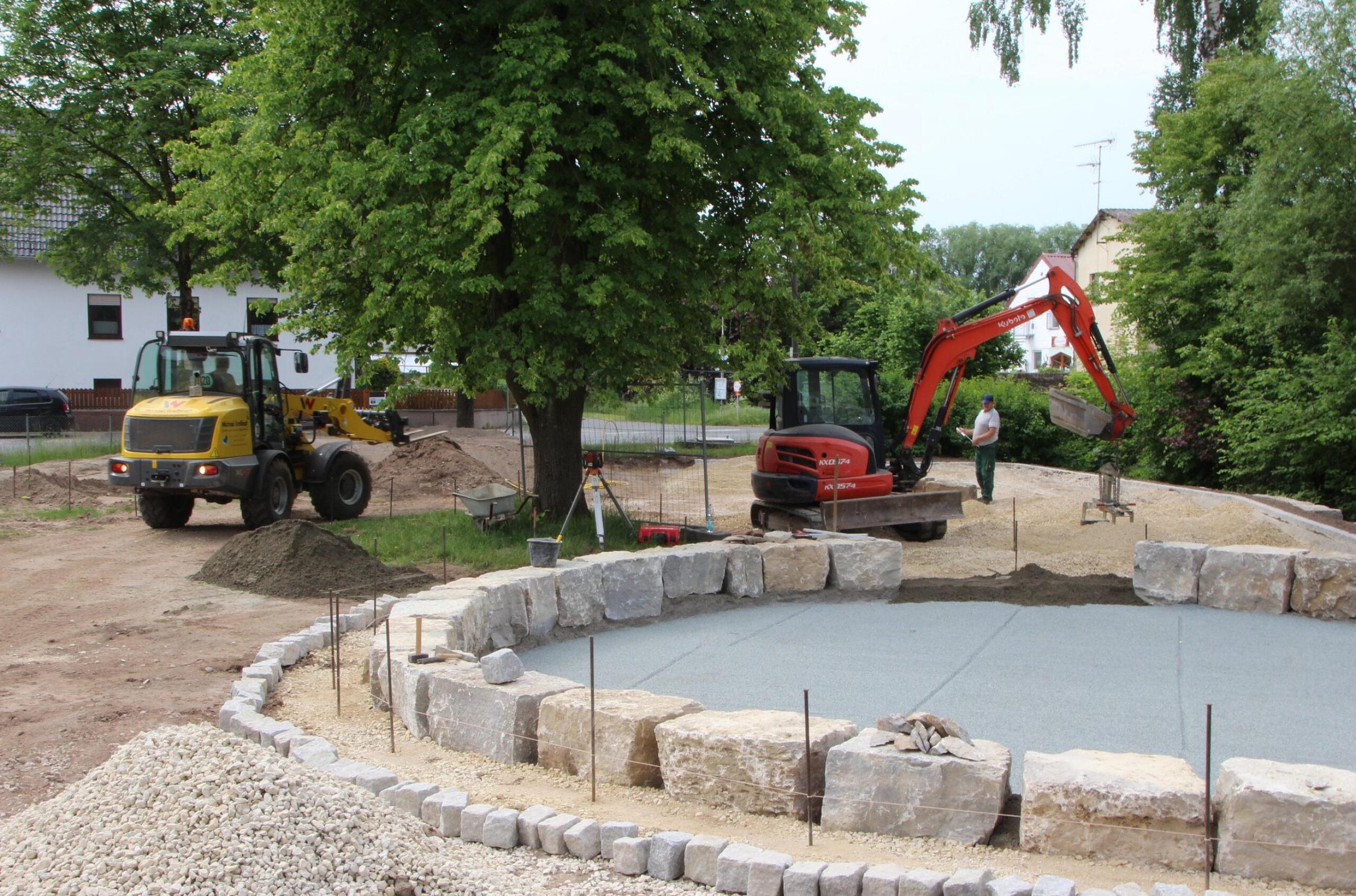 Die Bauarbeiten im Herzen Medbachs sind schon gestartet. Fährt man auf der Kreisstraße ERH 36 durch den Ort, kommt man fast zwangsläufig an dem Spielplatz vorbei, an dem sich nun Stein- und Erdhügel zwischen Bach und Bäumen aufhäufen.