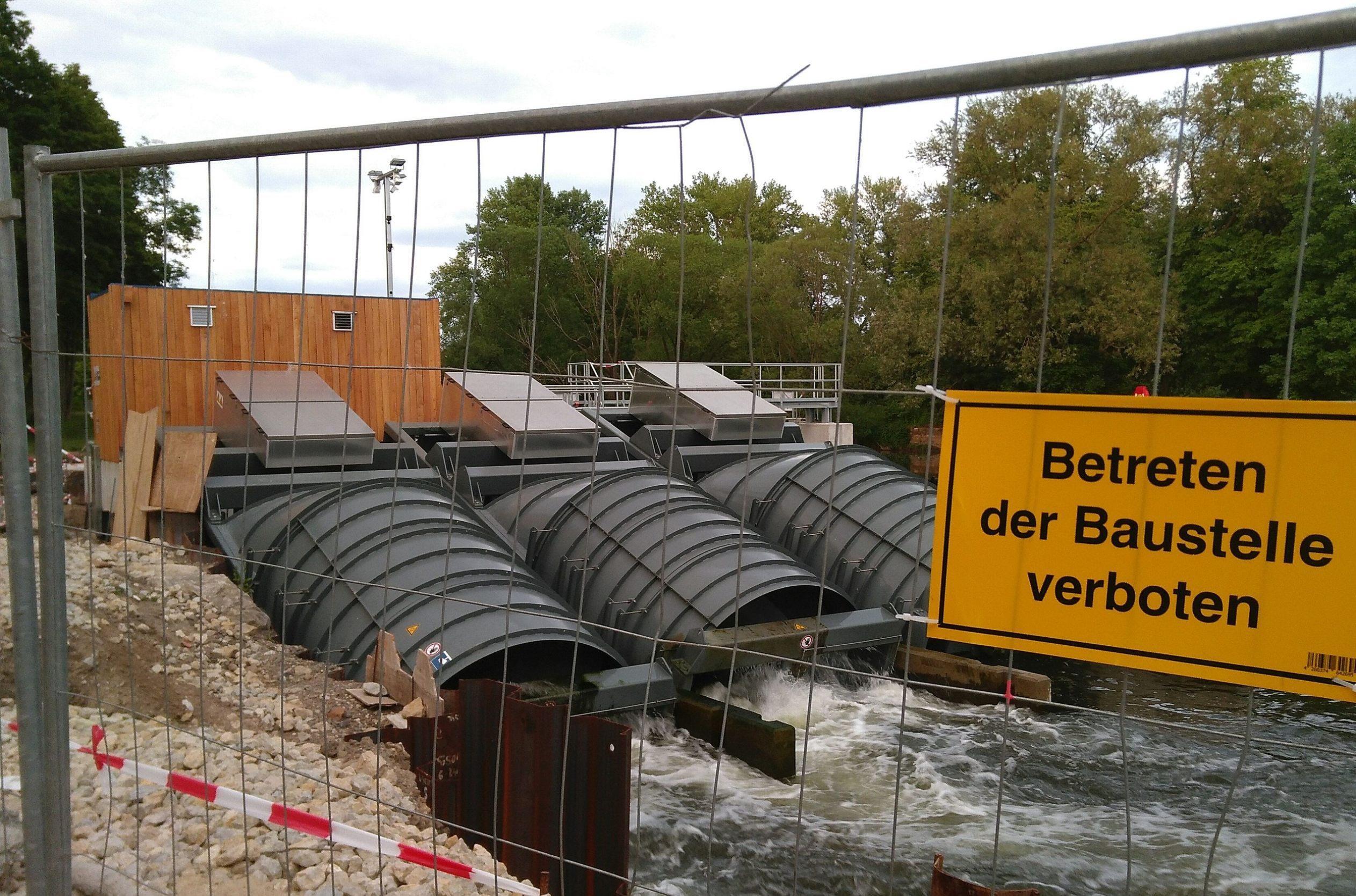 Noch ist die Anlage am Mainwehr eine Baustelle. Es wird dort aber schon Energie gewonnen - ein Beitrag zum Klimaschutz.