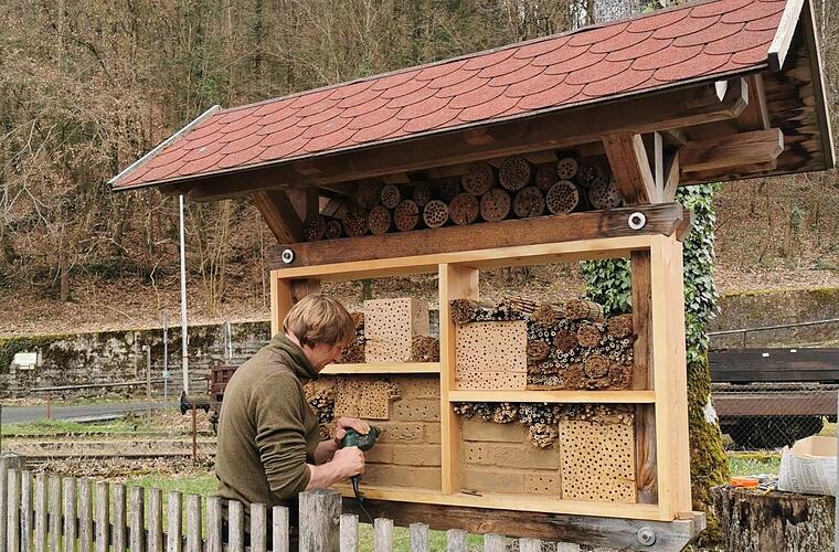 Wildbienen leisten ihren Beitrag zur Bestäubung von Blühpflanzen. Ranger in Muggendorf bauen eine vorbildliche Nisthilfe.